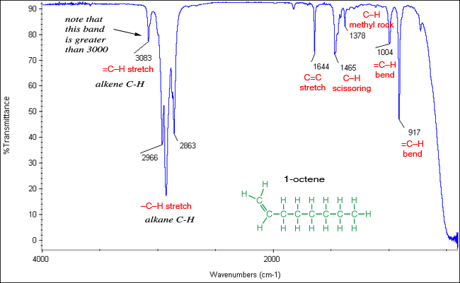 The IR spectrum of 1-octene is shown below. Note the band greater than 3000 cm-1 for the =CH stretch and the several bands lower than 3000 cm-1 for CH stretch (alkanes). The C=C stretch band is at 1644 cm-1. Bands for CH scissoring (1465) and methyl rock (1378) are marked on this spectrum; in routine IR analysis, these bands are not specific to an alkene and are generally not noted because they are present in almost all organic molecules (and they are in the fingerprint region). The bands at 917 cm-1 and 1044cm-1 are attributed to =C&Mac173;H bends.