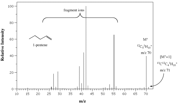 Figure 2. An electron impact mass spectrum (EI/MS) of 1-pentene showing the molecular ion, an isotope molecular ion, and fragment ions.