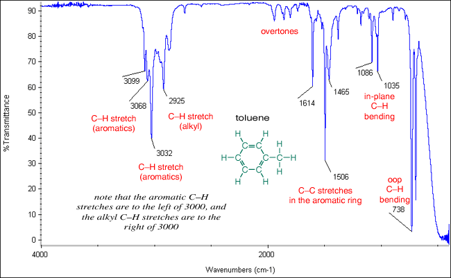 The spectrum of toluene is shown below. Note the =CH stretches of aromatics (3099, 3068, 3032) and the CH stretches of the alkyl (methyl) group (2925 is the only one marked). The characteristic overtones are seen from about 2000-1665. Also note the carbon-carbon stretches in the aromatic ring (1614, 1506, 1465), the in-plane CH bending (1086, 1035), and the CH oop (738).