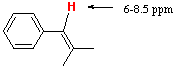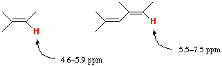 Alkene protons show up from 4.65.9 ppm. If the system is conjugated, they are shifted to 5.57.5 ppm.